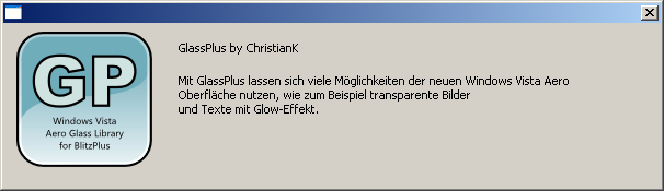 GlassPlus ermöglicht das Verwenden des Vista/7 Aero Designs mit BlitzPlus-Fenstern. Unter Windows XP wird automatisch auf einen Kompatibilitätsmodus umgeschaltet.