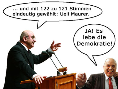 Hehe, Who, du glaubst es kaum, aber ich hatte vorher tatsächlich eine ähnliche Idee wie du. Ich wollte zuerst einfach ein Screen von einer Abstimmung hier zur BAC#72-Abstimmung umfaken, dabei aber alle Radiobuttons, ausser meinen, inaktiv setzen Wink Allerdings war zu dem Moment grad keine Abstimmung im Gange und drum hab ich mich für das Maurer-vs.-Demokratie-Bild entschieden Smile zuerst bereute ich meinen Entscheid ja noch, aber - muahaha - jetzt sehe ich, dass er mir immerhin eine zusätzliche Stimme eingebracht hat Mr. Green