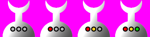 Aufgabenstellung: Ziel ist es, die Seifenblasenmaschine zum laufen zu bringen; Die Lichter sollen in einem Zeitlichen Abstand aufleuchten, und wenn das Grüne Licht angeht, soll eine Seifenblase entstehen. Die Seifenblase schwingt ein bisschen herum (die ersten 3 Frames) und ist dann eine Zeit lang eine stabile Kugel, bis sie zerplatzt. Es reicht, wenn gleichzeitig eine Maschine und eine Seifenblase existieren - wer es schon so weit geschafft hat, kann z.B. mit Types ( ) beliebig viele Seifenblasen erstellen.