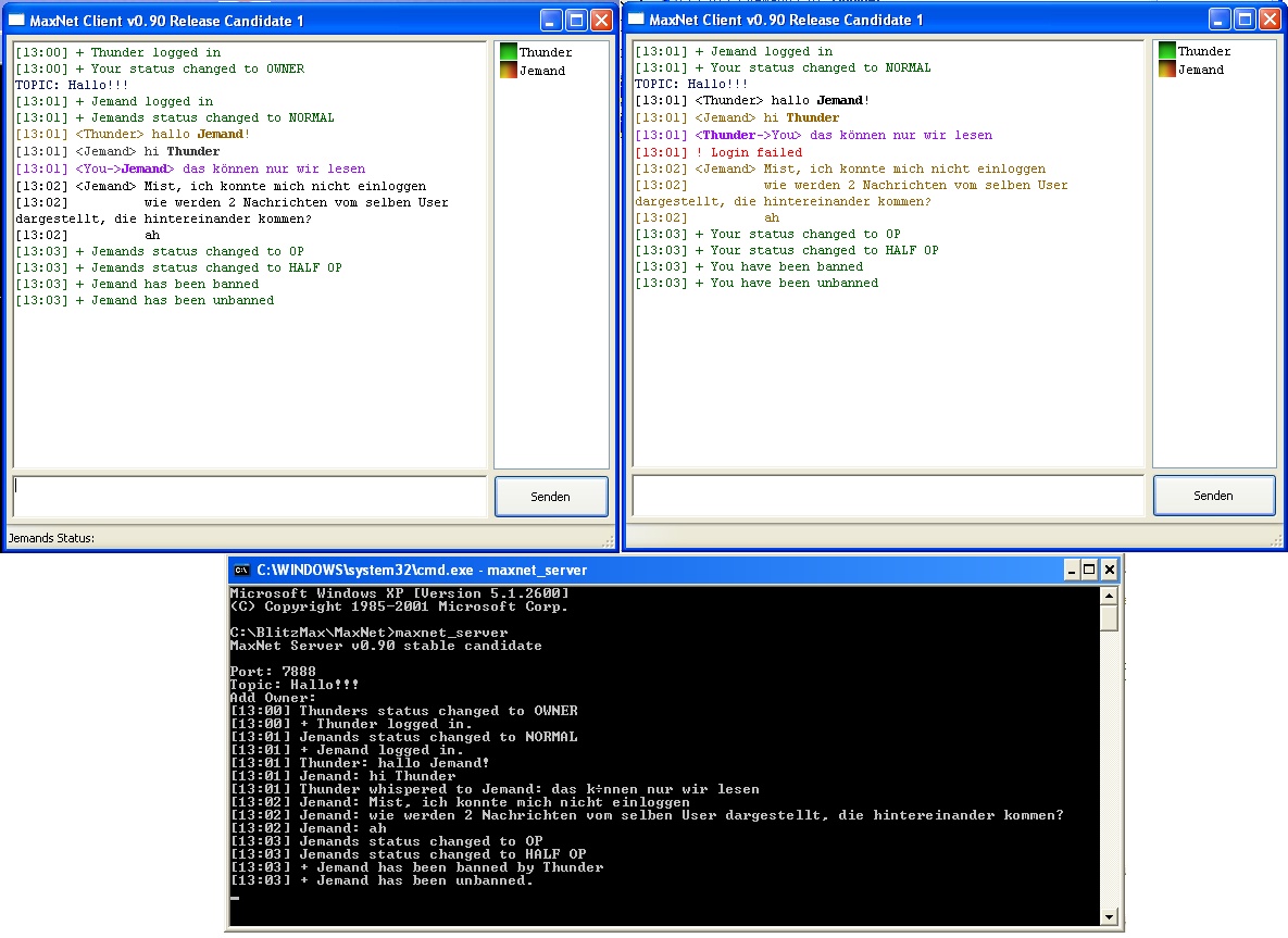 Plötzlich gab es einen Bug (ich dachte bis vor kurzem, es wären mehrere) der die Clients verwirrt hat (mich auch). Manchmal sind User nicht in der Userliste der anderen aufgetaucht und der Text "xxxs status changed to yyy" wurde manchmal nicht gesendet.